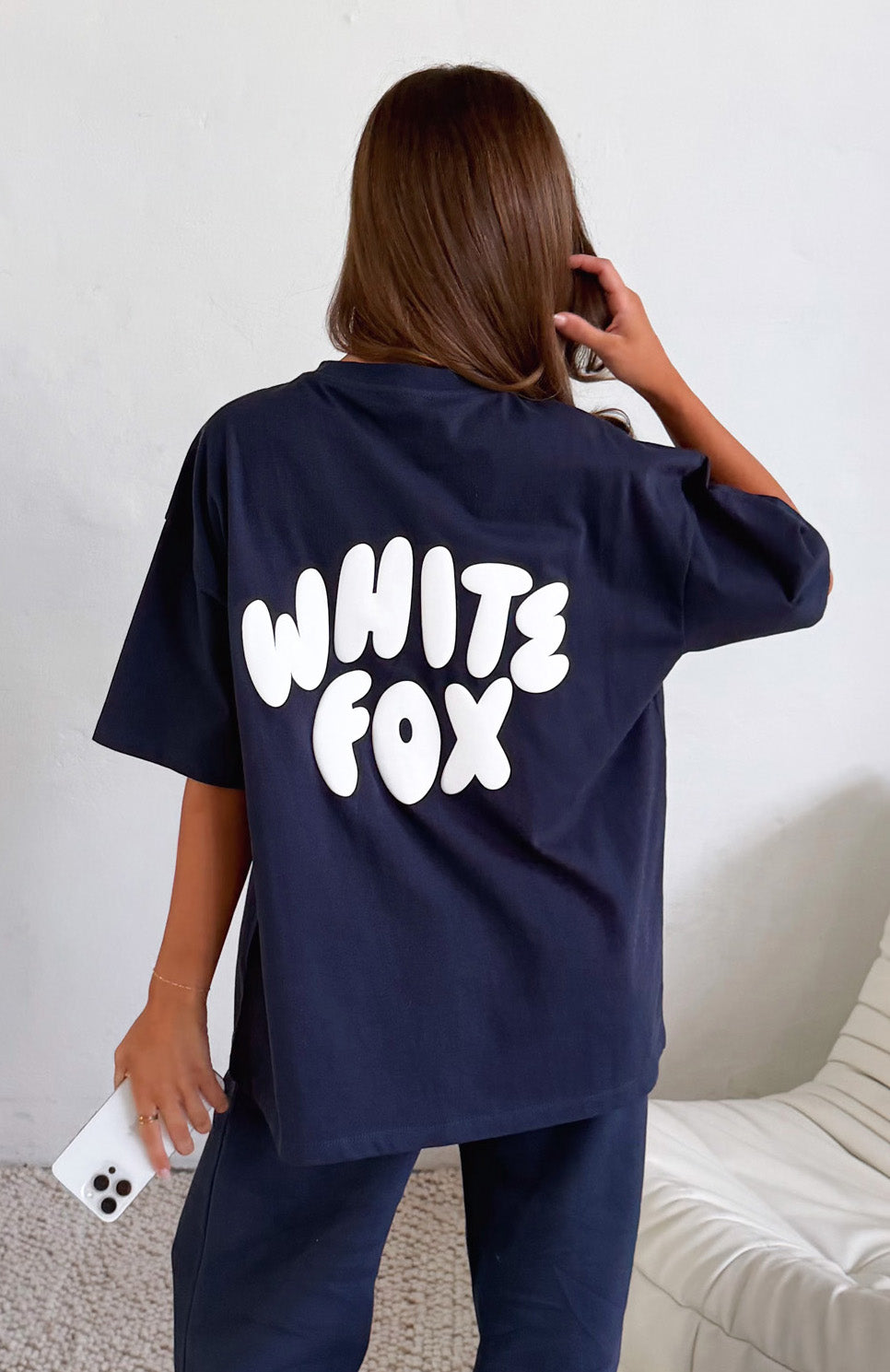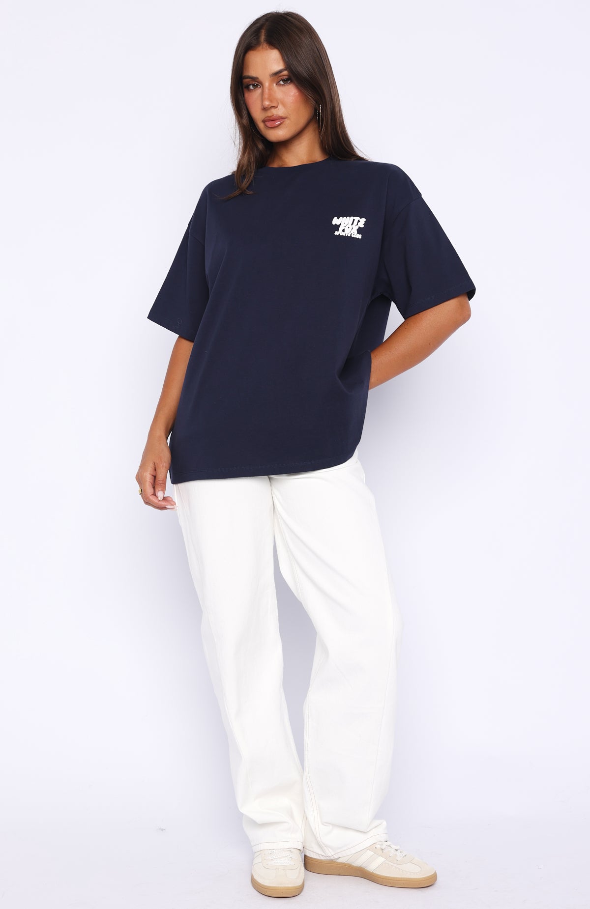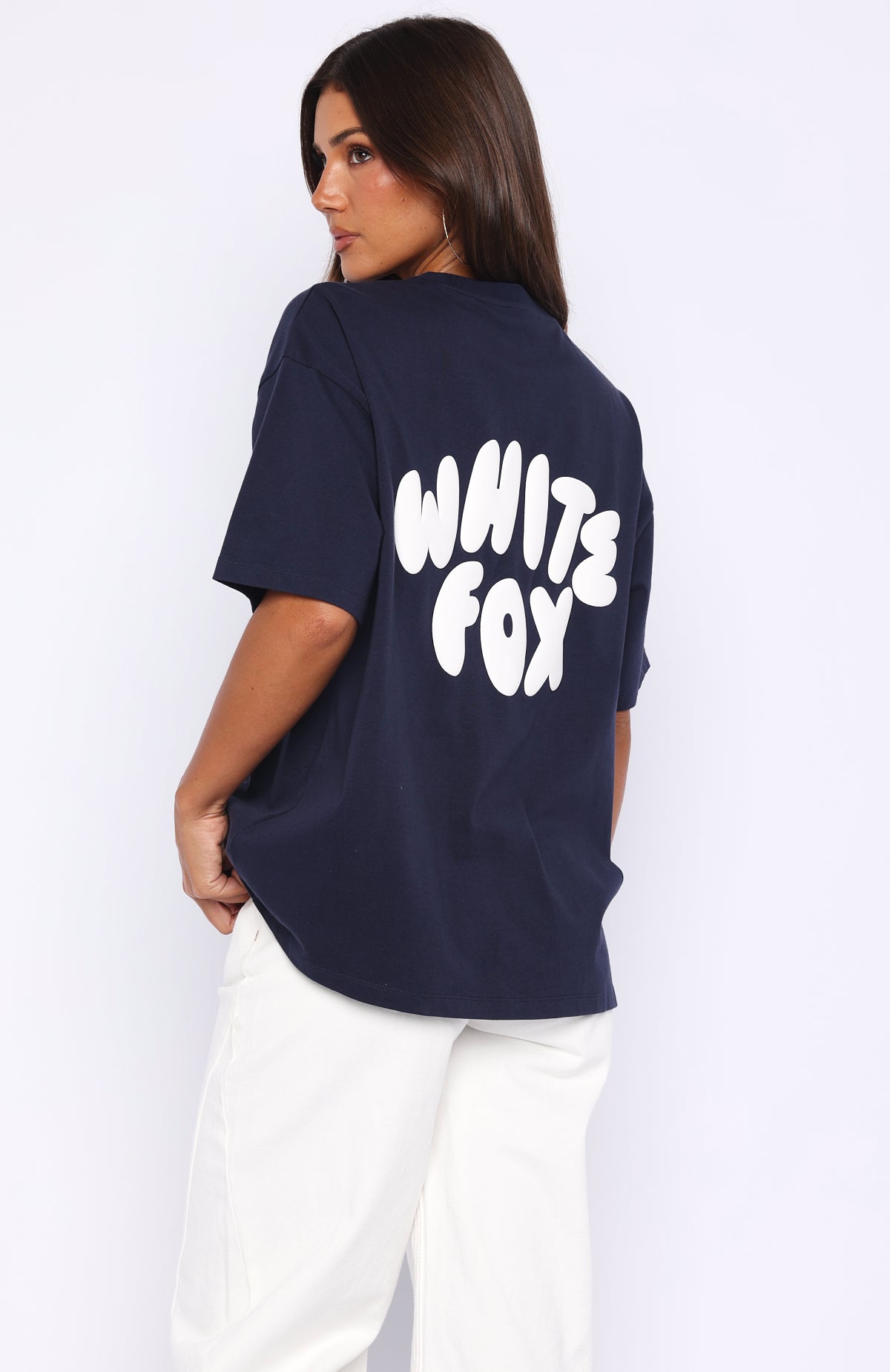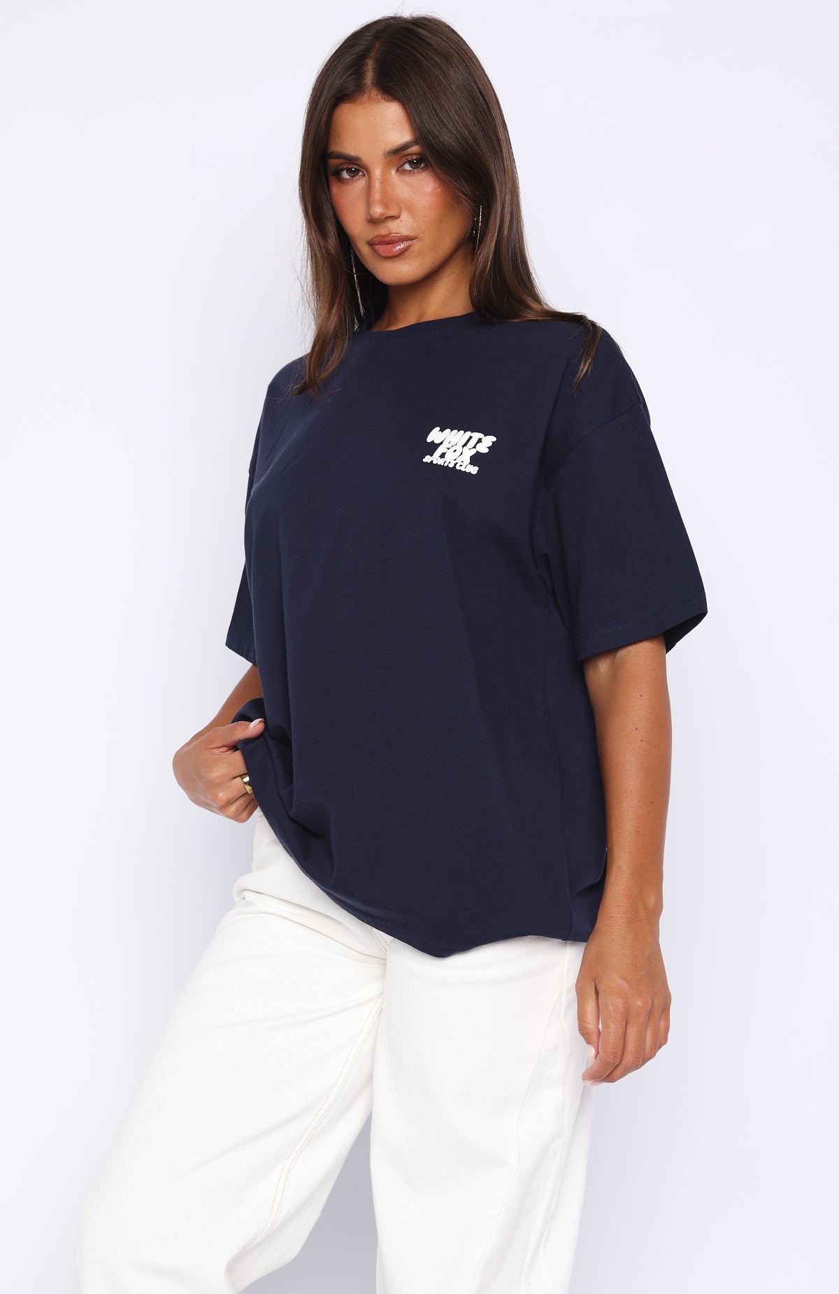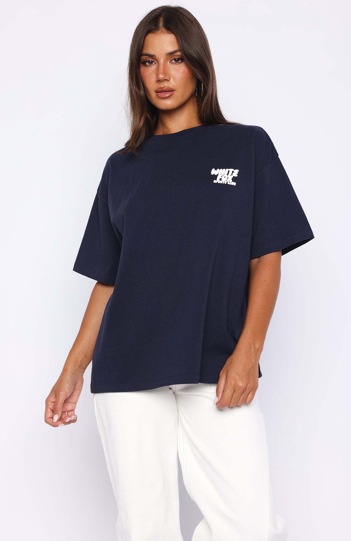 Get loud. Go bold. Sport that Club 14 Allie Oversized Tee in Navy! Features slouched shoulders, classic crew neckline, breezy short sleeves and puff print White Fox logo side front and centre back, all on a comfy, oversized silhouette. Style with matching bottoms and your fave sneakers for a cute sporty vibe.