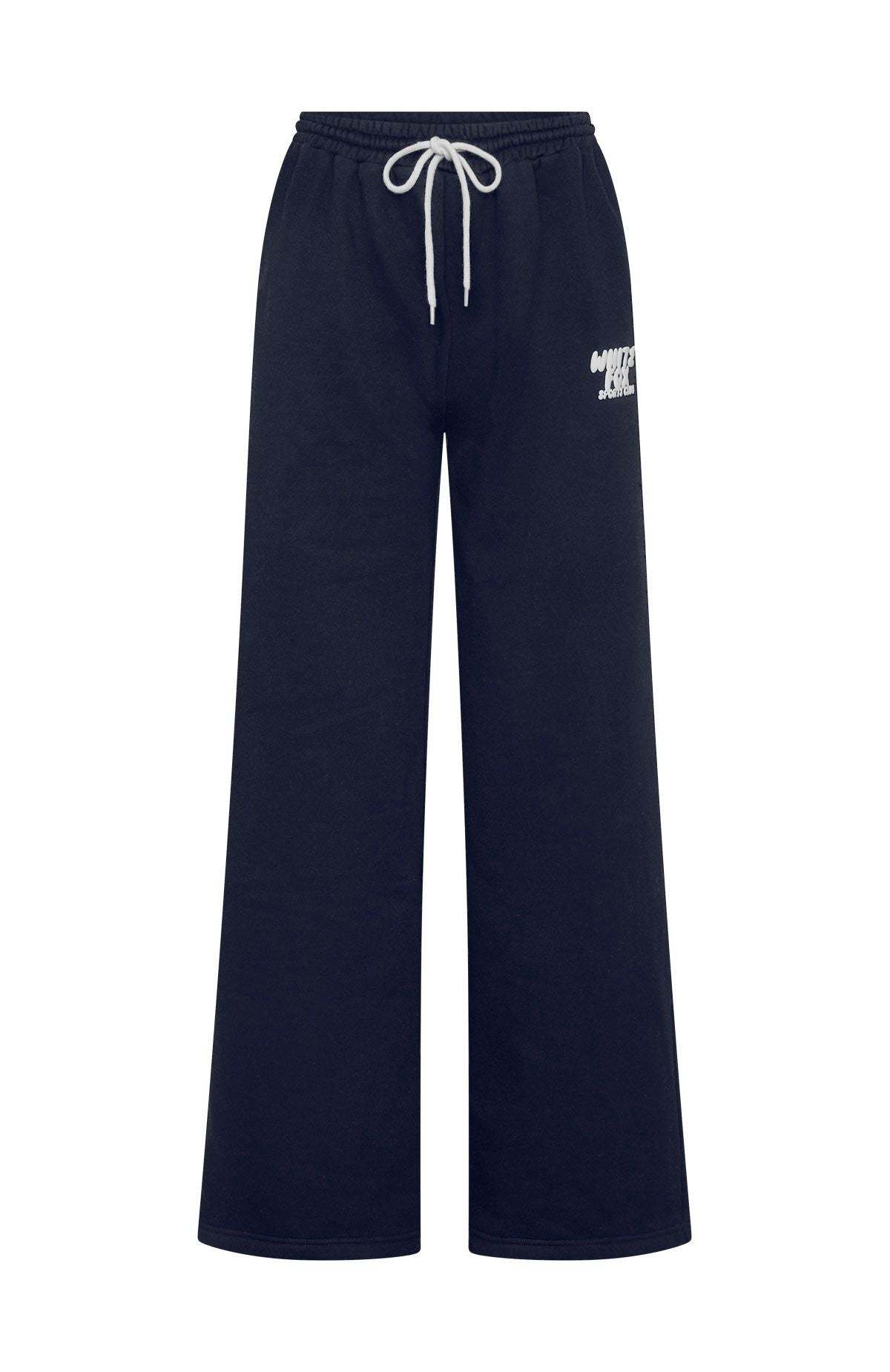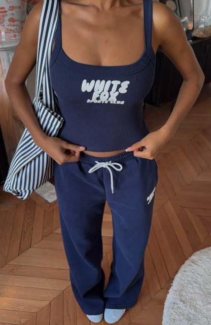 Getting chilly! The Club 14 Allie Wide Leg Sweatpants Navy features a thick elasticated waistband with contrast-colour external drawstring, a wide-leg silhouette and oversized fit, practical side pockets and a bold White Fox puff-print logo. Style with the matching Club 14 Allie Boxy Zip Front Hoodie for the perfect blend of comfort and standout street-style appeal.