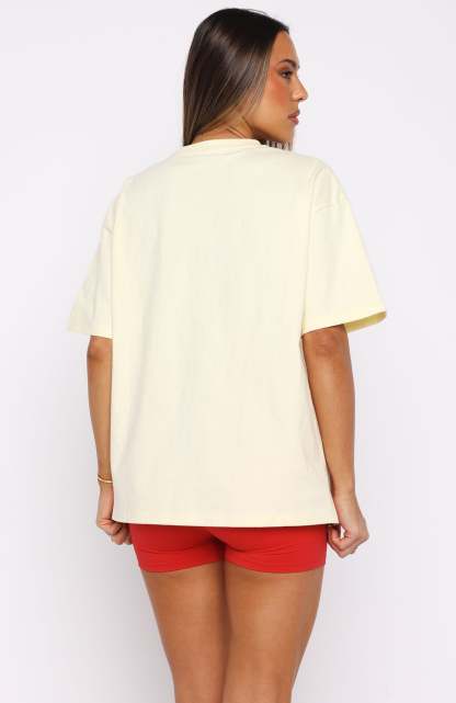 Weekending done right in the Club 14 Izzy Oversized Tee Lemon! Tailored with a classic crew neckline, relaxed slouched shoulders, breezy short sleeves and oversized silhouette. Finished off with a White Fox puff-print text at the front, layered over a playful cherry graphic for a standout statement. Style with the matching Club 14 Izzy Lounge Shorts and layer with the Club 14 Peyton Oversized Hoodie for colder days.