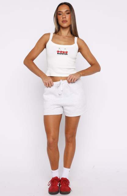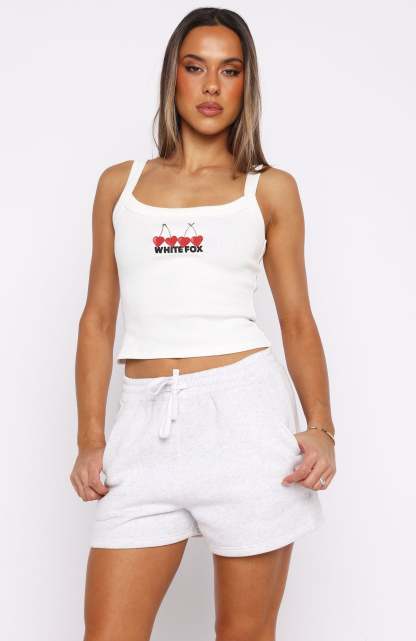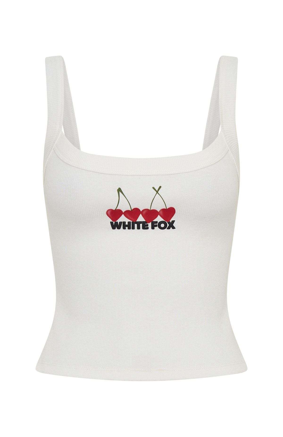 BRB adding to cart! Meet the Club 14 Taylah Singlet Top White. Crafted from a ribbed, unlined fabric, it features thick shoulder straps and a thick binded scoop neckline. Finished with a puff print White Fox text and a printed cherry graphic, adding a playful touch to its minimalist style. Style with any of the matching Club 14 lounge sets for a coordinated fit.